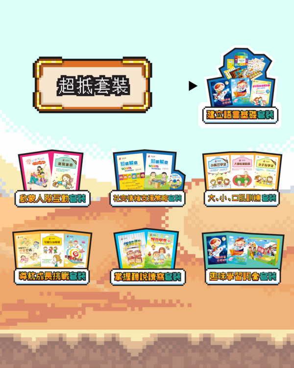 推出7款限定套裝,按語言學習、行為支援及社交情緒等主題,精選書籍及桌遊,以套裝優惠價發售