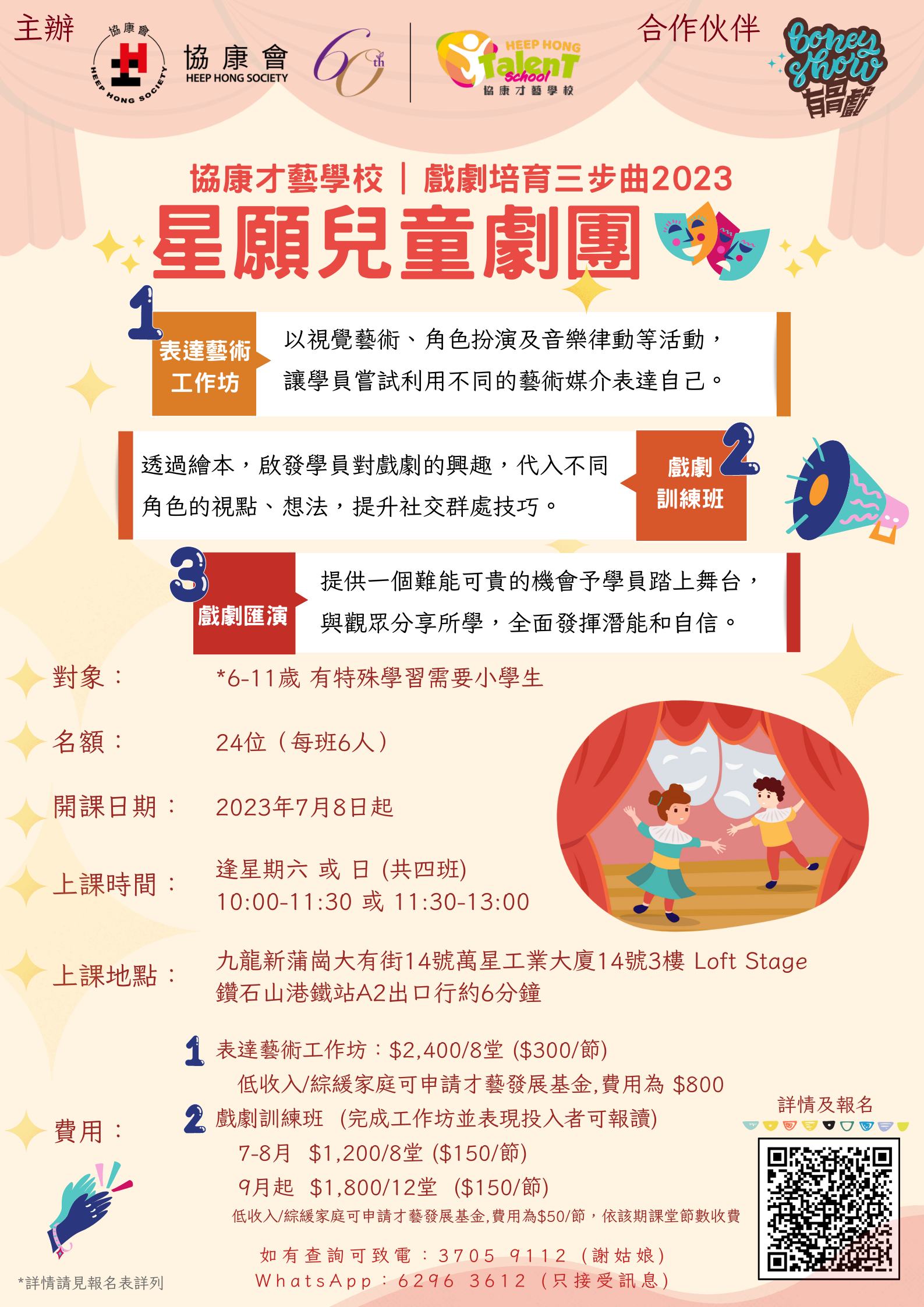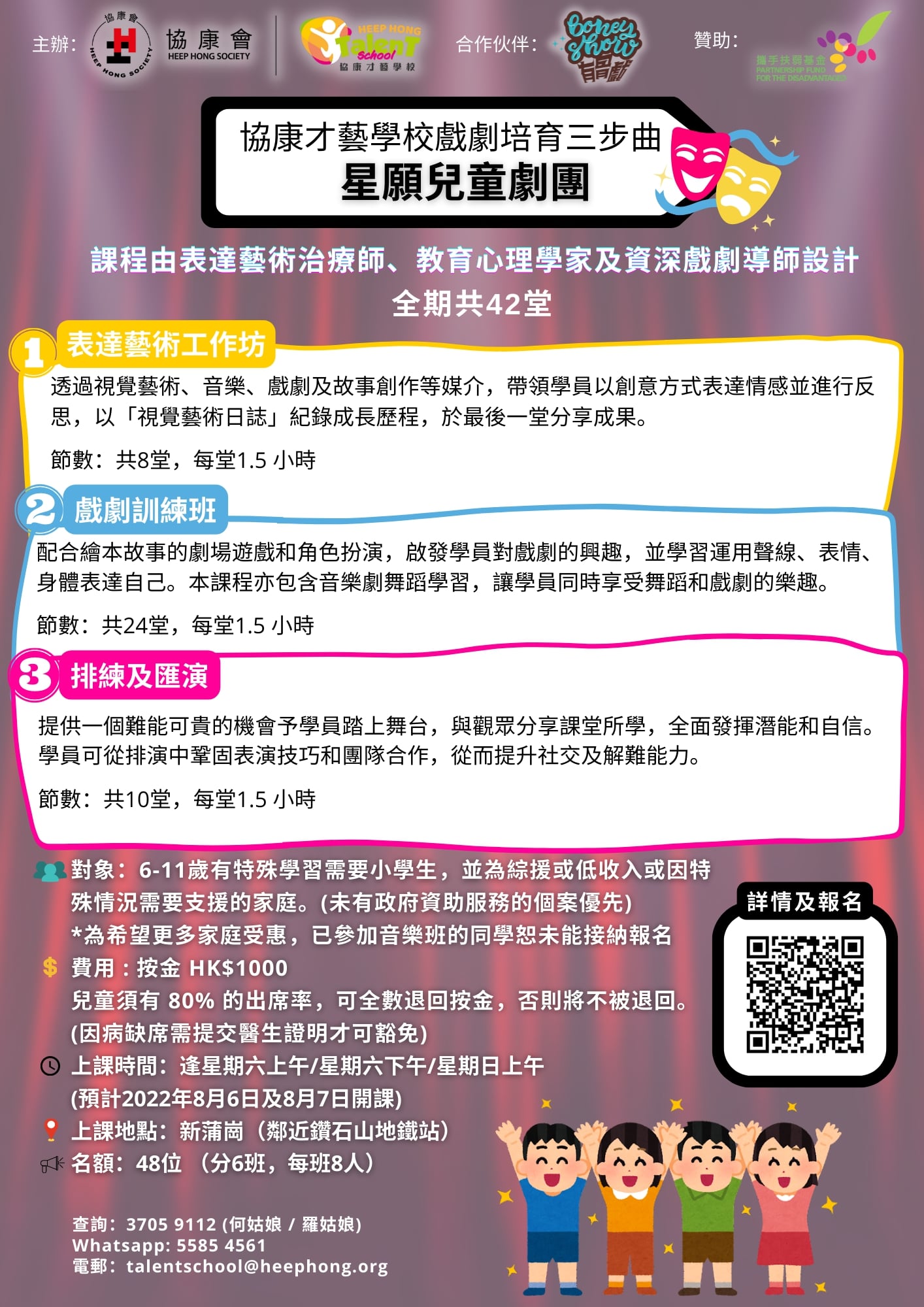 • 戲劇:戲劇著重情感交流,有助語言及溝通能力發展,並建立自尊及成就感。我們現正舉辦戲劇工作坊,讓更多兒童可以接觸表演藝術,甚至有機會踏上舞台,獲得演出經驗,享受表演樂趣並增強自信心。
