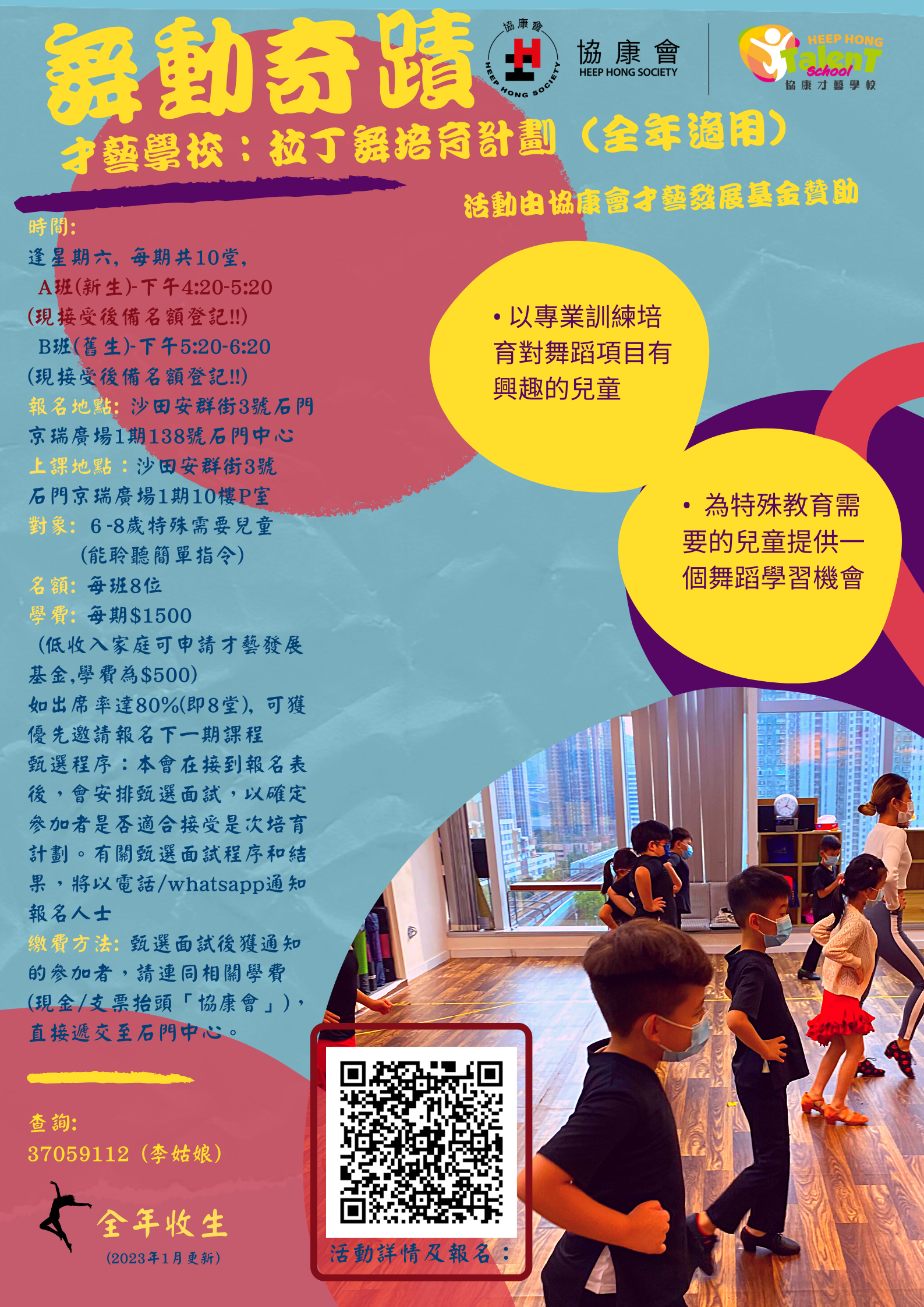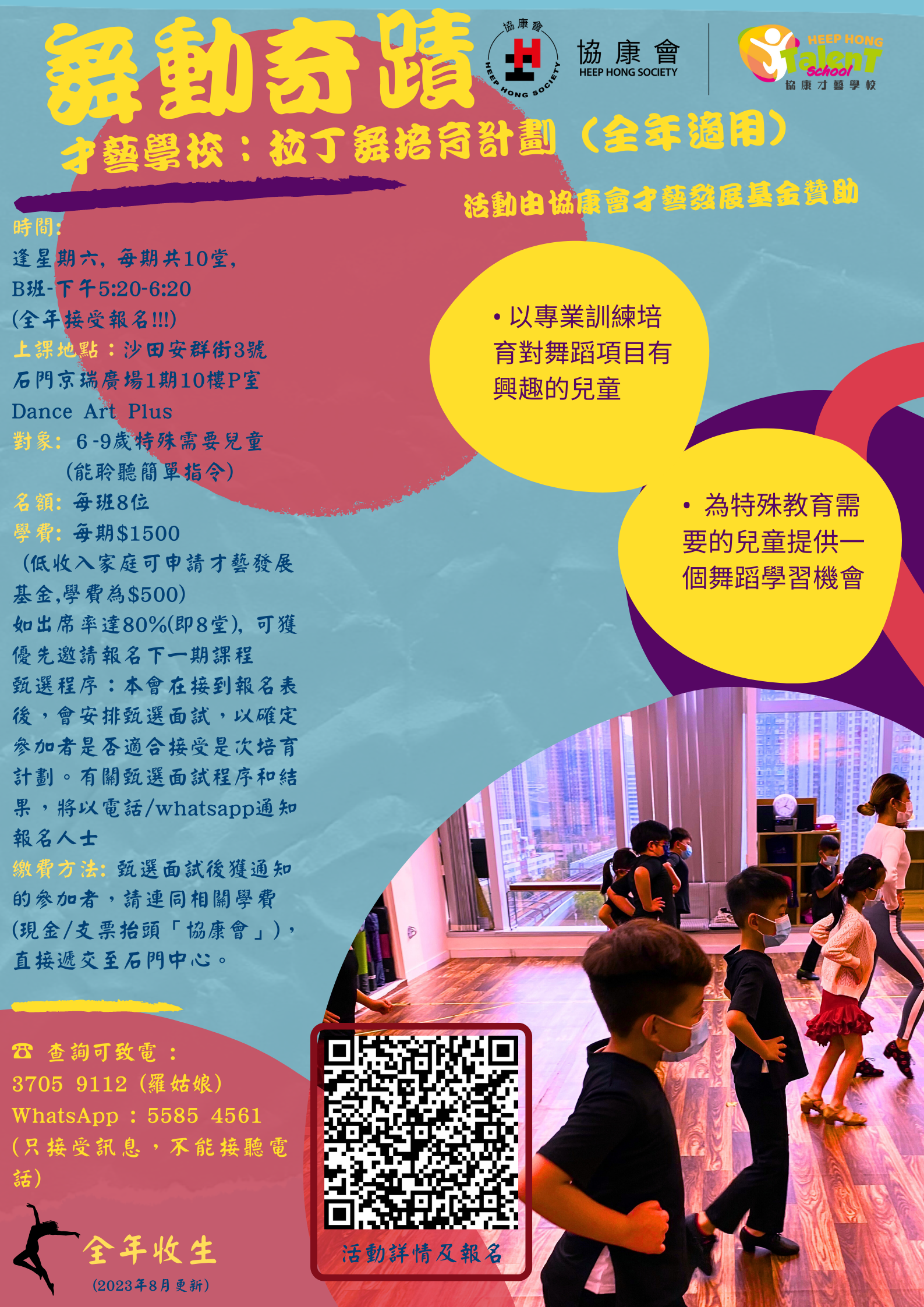 • 舞蹈:舞蹈活動著重身體柔軟度與靈活性,同時增強兒童及青年聆聽指令及手腳協調的能力。我們持續推行兒童拉丁舞及流行舞培育計劃,期望孩子在不同舞台上展現成果,建立自信。