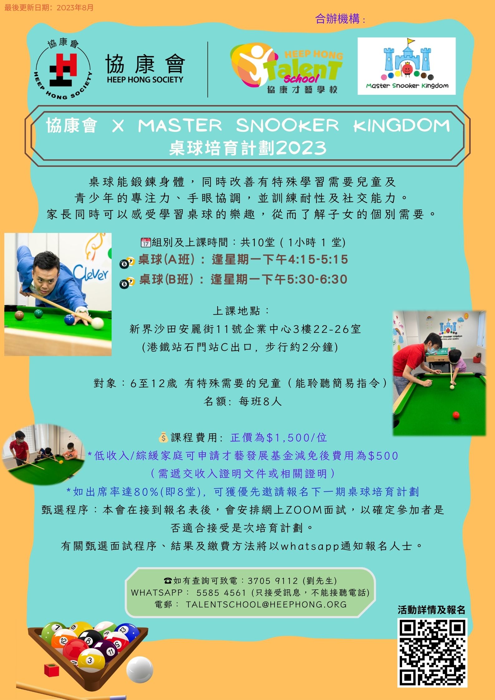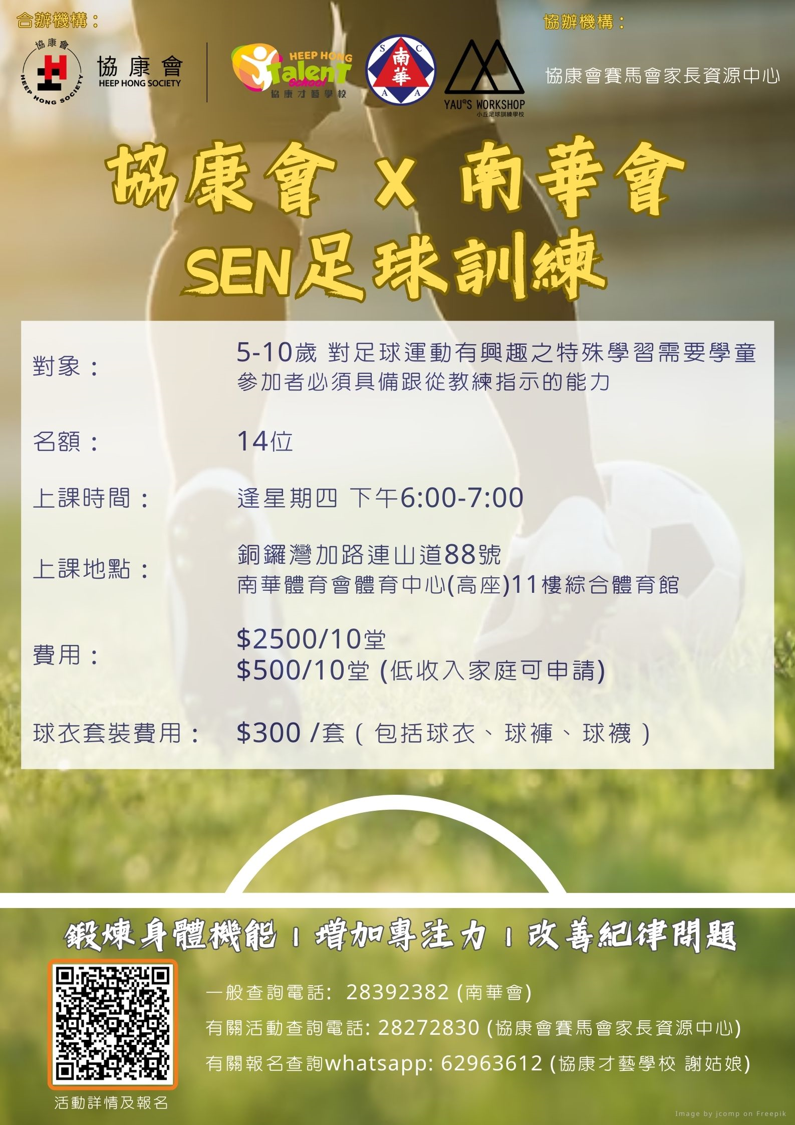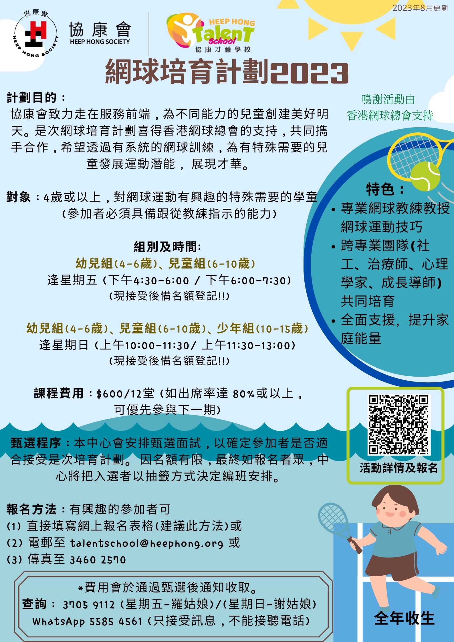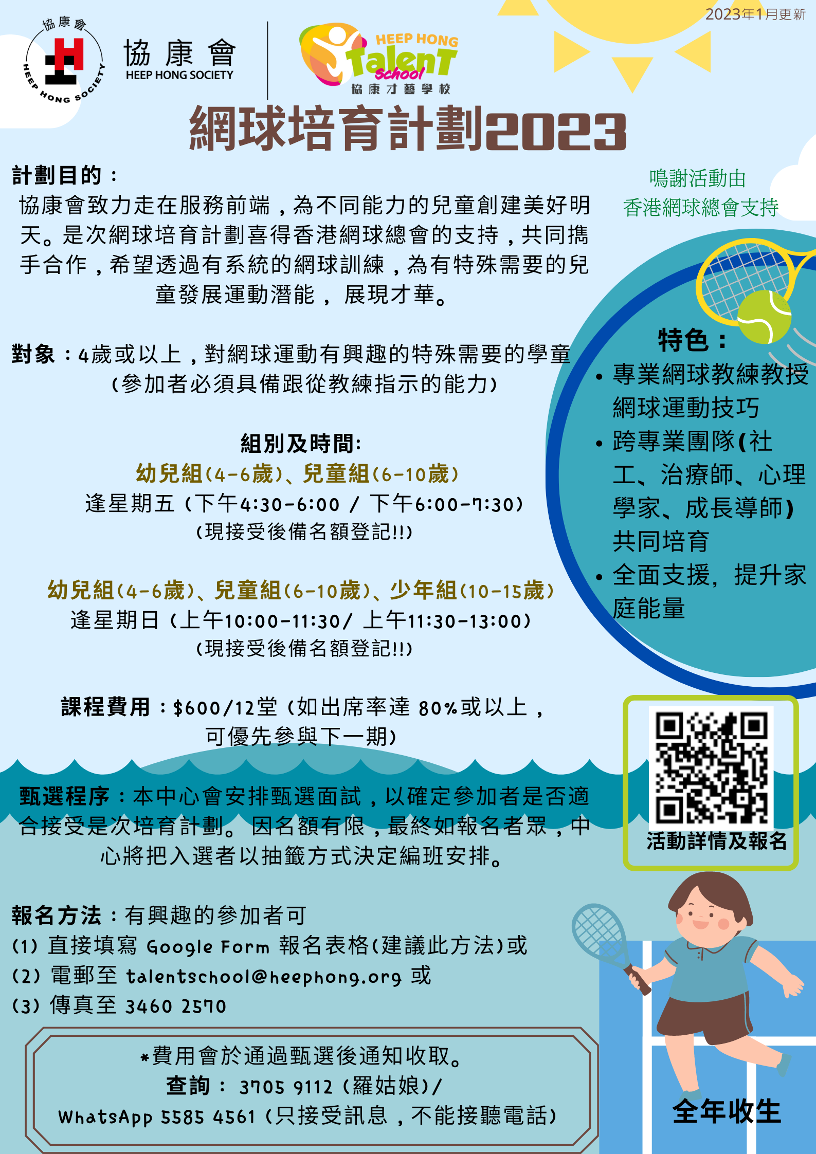 • 運動:我們致力推動多元化的運動項目,包括網球、滾軸溜冰、空手道、桌球、足球及乒乓球,有助兒童及青少年大肌發展、遵守紀律及發展運動技能。同時,運動項目著重體育精神及團體合作,讓兒童及青年學習社交技能,於人際相處會有莫大的益處。