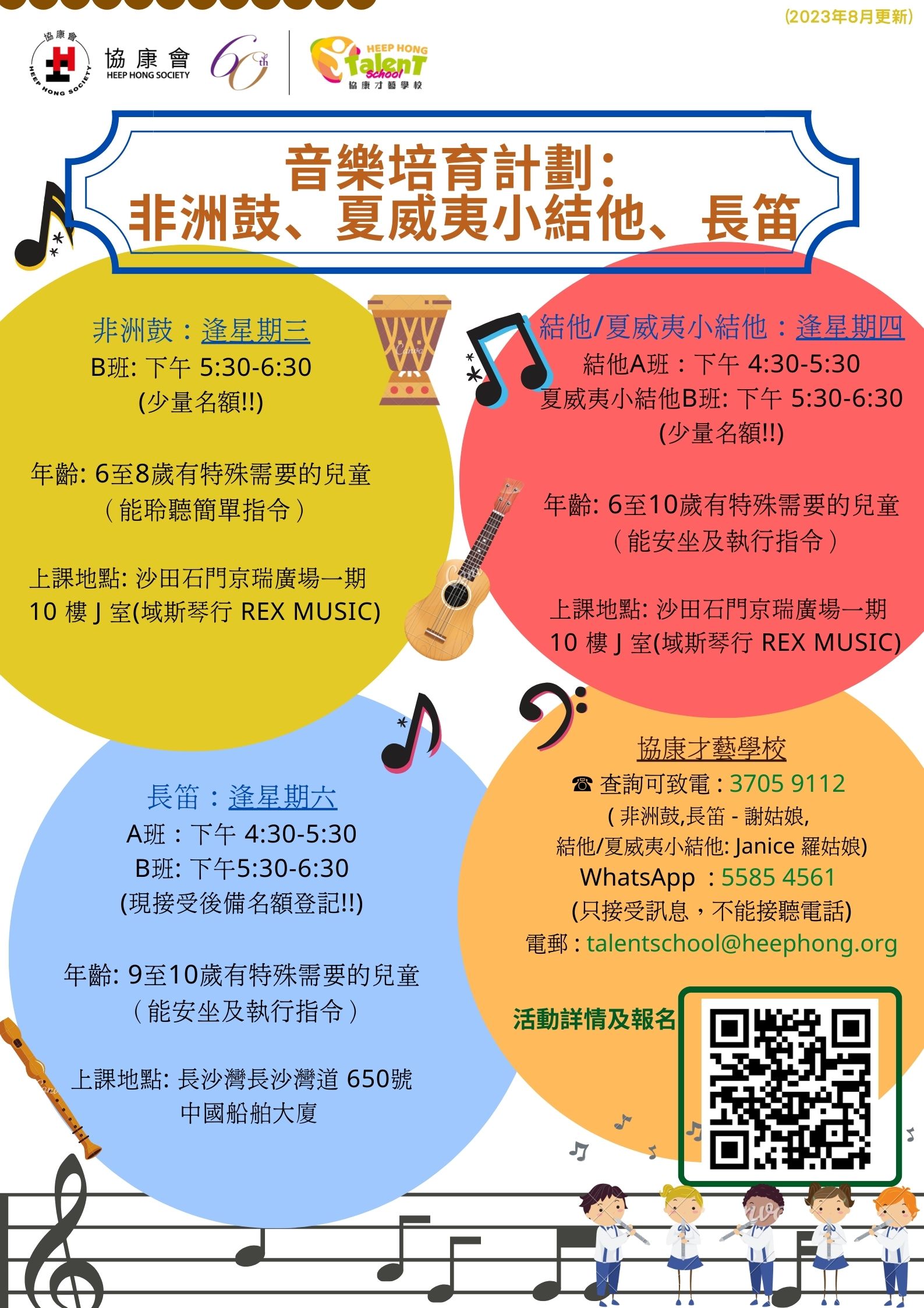 • 音樂:學習樂器需動腦、動手及動耳朵,有助身心協調及提升專注力及記憶力。研究指出,童年音樂經驗能促進大腦發展,尤其在語言學習及閱讀方面。我們現正開辦三類樂器小組課程:夏威夷小結他、長笛及小提琴。